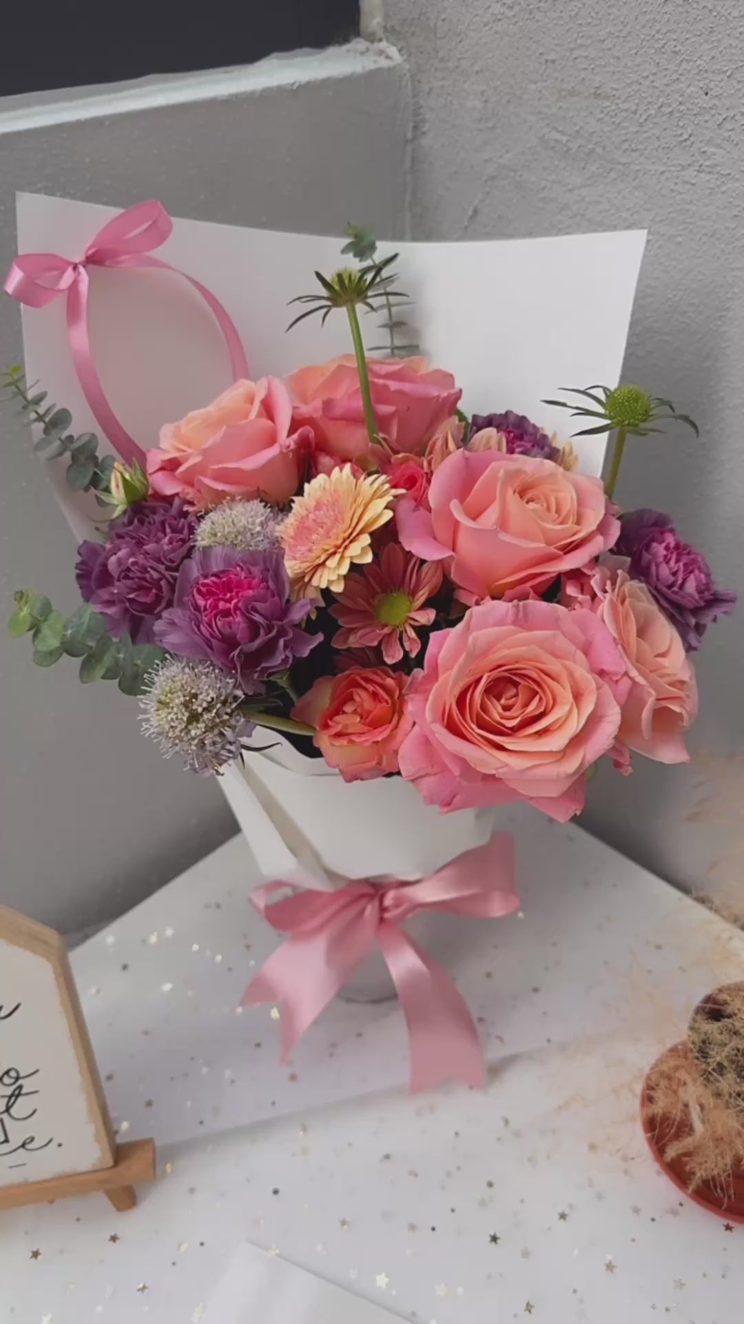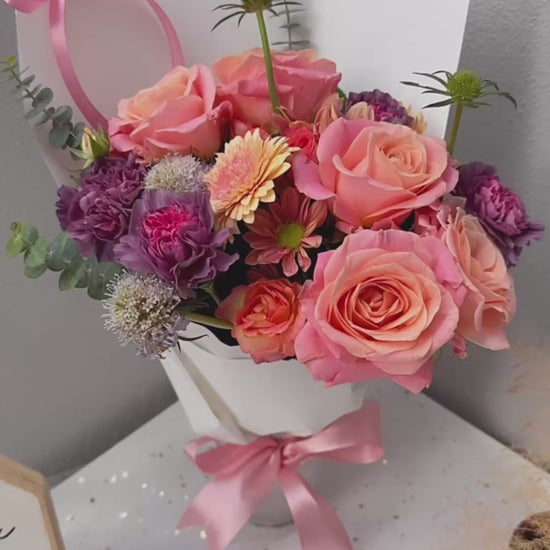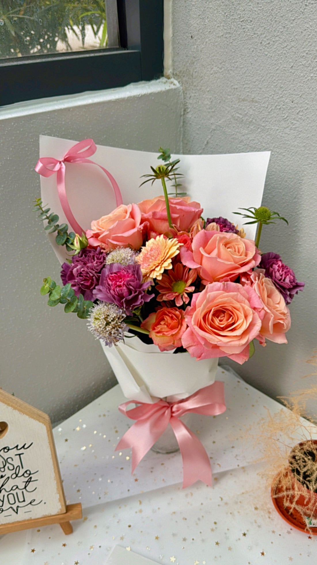 Roses, Carnations, Gerbera with Eucalyptus, Trachymene, Chrysanthemum, Astrantia